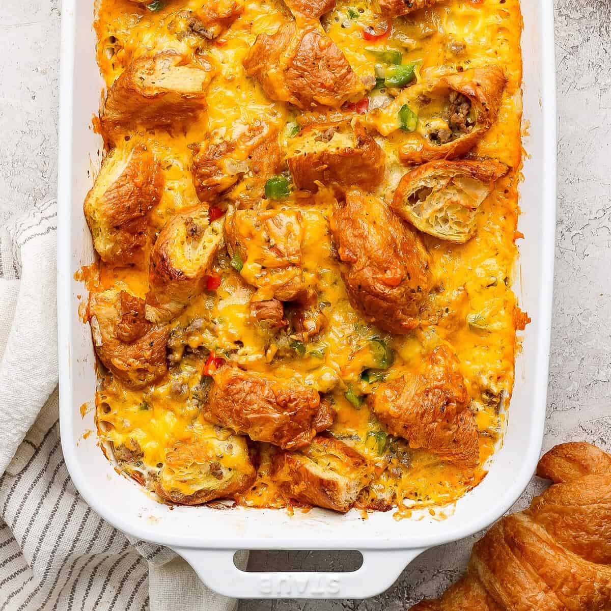 This Croissant Egg Bake brings together flaky, buttery croissants and fluffy, veggie and sausage-packed eggs to make all of your breakfast wishes come true. Whether you’ve got leftover croissants or need a brunch recipe to serve a crowd, this casserole has got you covered.